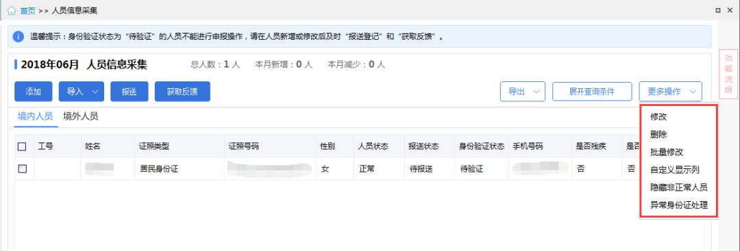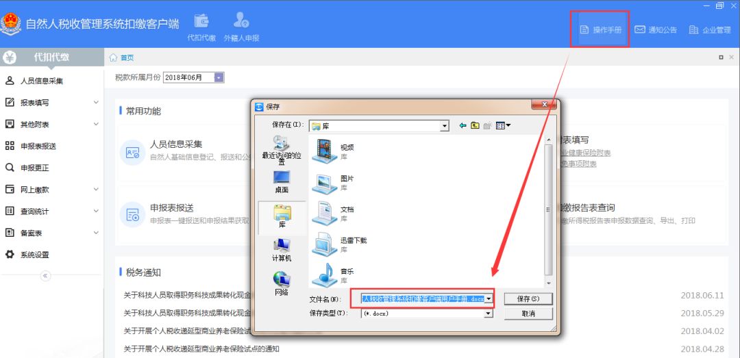 ❸ 人员信息导入模板:因人员信息采集字段调整,导入模板随之调整,请下载最新的模板录入数据。 ❹ 更多操作:原有“修改”、“删除”、“批量修改”、“自定义显示列”、“隐藏非正常人员”、“异常身份证处理”功能统一放置“更多操作”中,如图: ❹客户端右上角增加“操作手册”可供下载使用,如图: 馨提示: ❶原“金税三期个人所得税扣缴系统”升级后,名称将变为“自然人税收管理系统扣缴客户端”看到了新的图标,别不认识了哈~